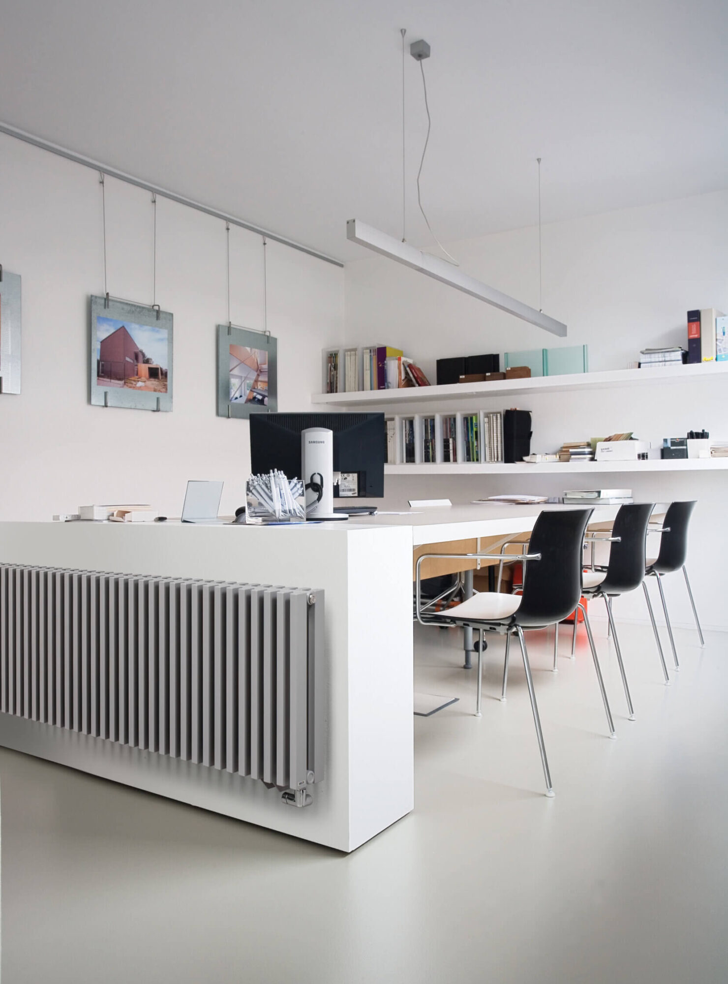 The horizontal version of the Zana designer radiator is a splendid example of class, power and comfort. The vertical pipes and horizontal collectors form a nicely structured geometric.